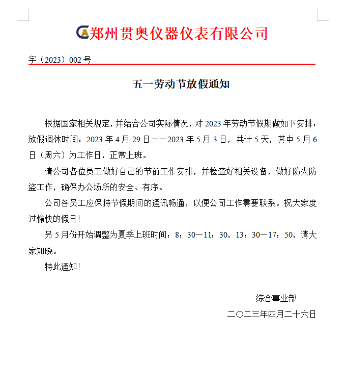 根據(jù)國家相關(guān)規(guī)定,并結(jié)合公司實際情況,對2023年勞動節(jié)假期做如下安排: