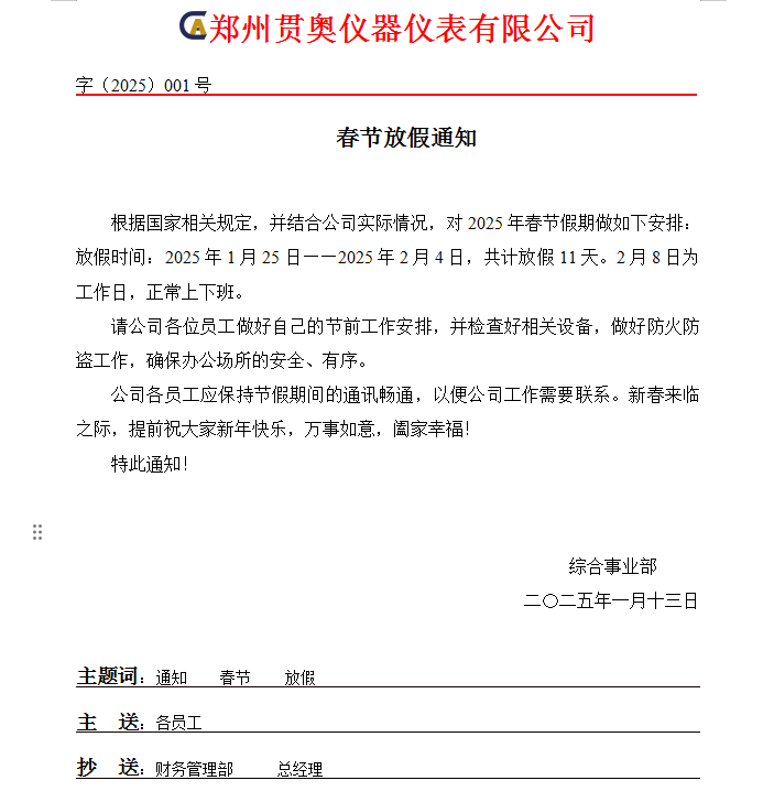 根據國家法定節假日安排,結合公司實際情況,2025年春節假期具體安排如下: