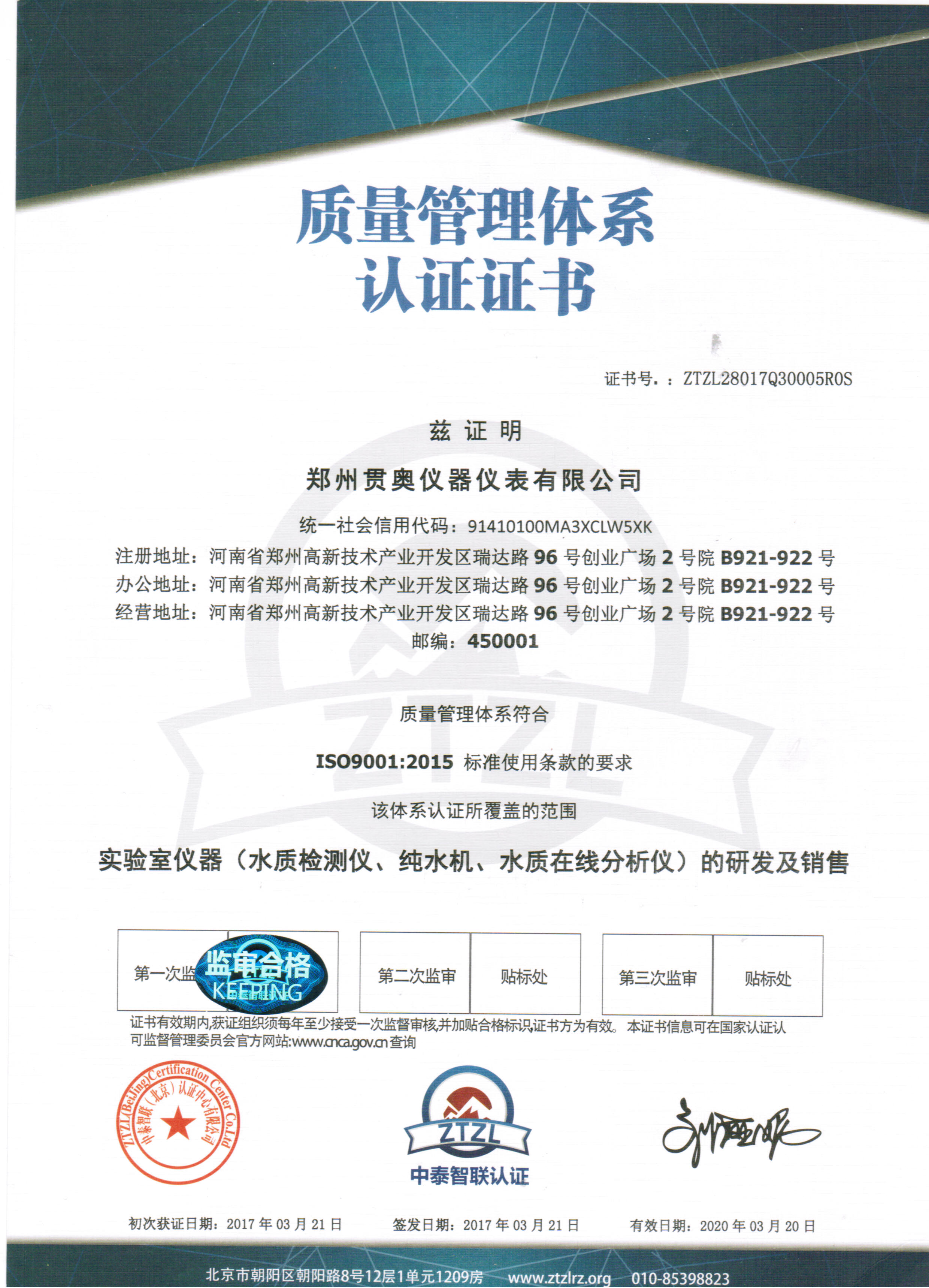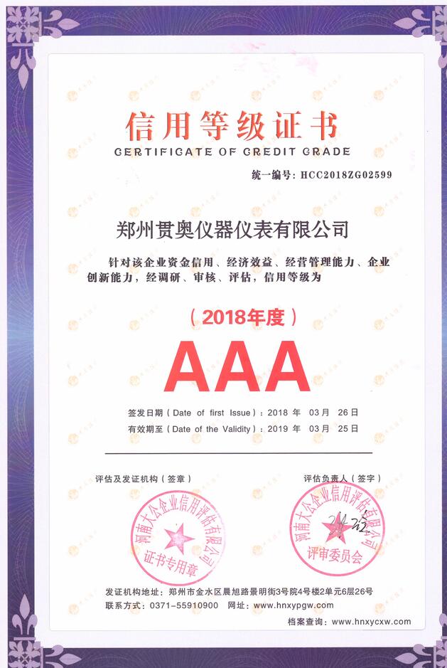 鄭州貫奧儀器儀表有限公司的所有設備均經(jīng)過省級計量院認證和檢驗,貫奧其儀器儀表非常重視知識產(chǎn)權(quán)的研發(fā)和保護。公司獲得了"ISO9001:2015"質(zhì)量管理體系認證證書,ISO14001:2015環(huán)境管理體系認證證書,OHSAS18001:2007職業(yè)健康安全管理體系認證證書。鄭州貫奧儀器儀表有限公司企業(yè)信用等級評級"AAA"。